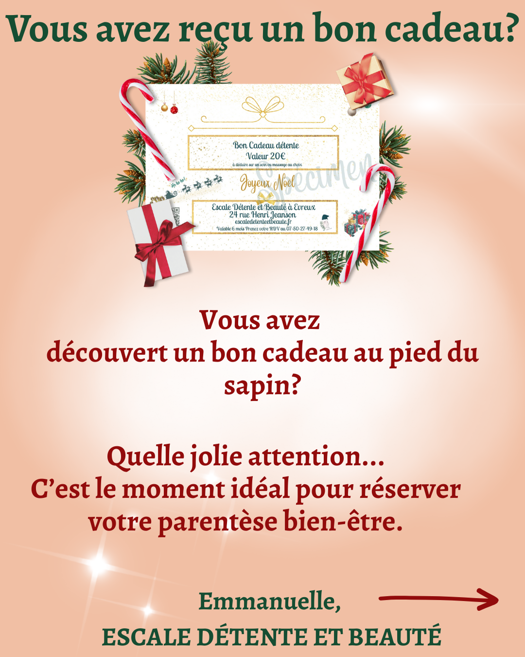 Je vous rappelle que l’institut fonctionne uniquement sur RDV y compris pour l’achat de bons cadeaux. Nous conviendrons ensemble d’un moment dĂ©diĂ©, afin de vous accueillir avec toute l’attention nĂ©cessaire sans interrompre les soins en cours ou par voie dĂ©matĂ©rialisĂ©e pour les bons Ă distance.
