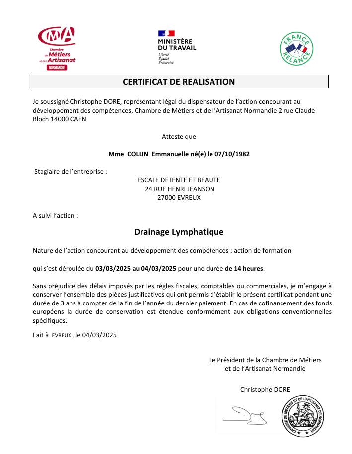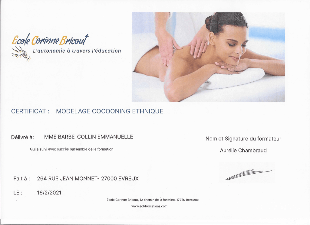 Depuis 2018, j’ai enrichi mes compétences avec plus d’une vingtaine de formations pratiques en massages, ainsi que des formations en gestion d’entreprise, communication digitale et création de site web.