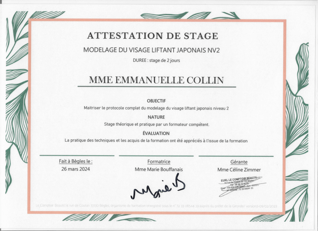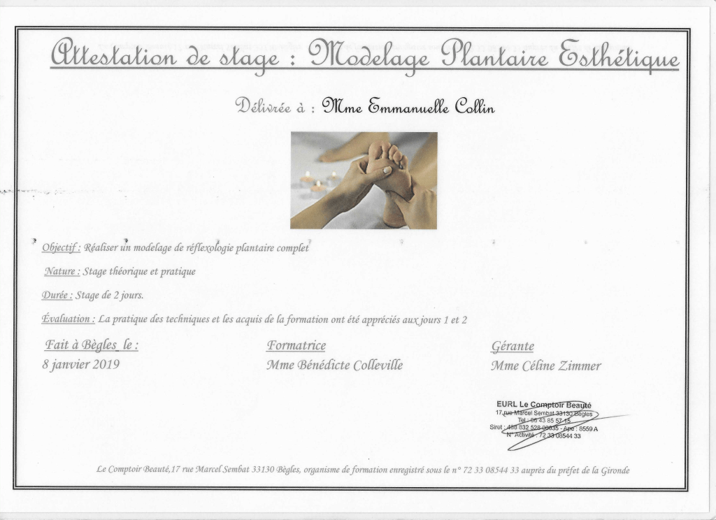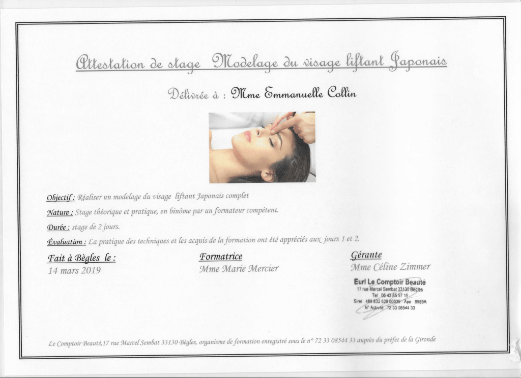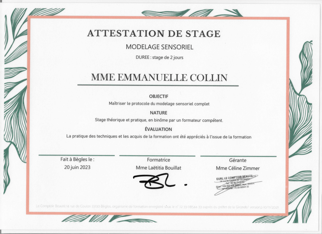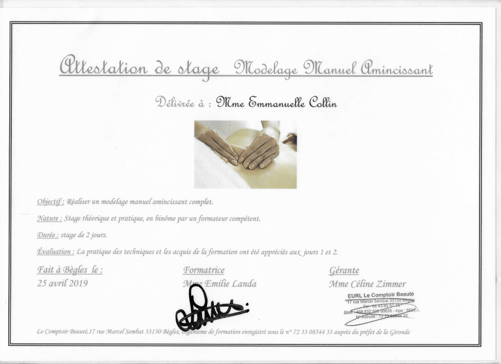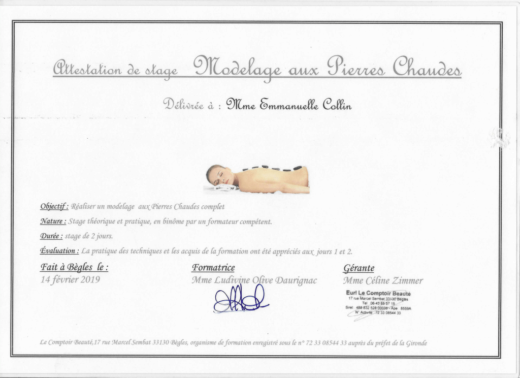 Fraichement diplômée du massage Tsubo du ventre, un massage énergétique, du massage Quartz & Rose, un massage exclusivement destiné à la femme et les étapes de sa vie ainsi que le massage Ganshana je continue à me perfectionner régulièrement, notamment au centre de formation « Le Comptoir Beauté » à Bordeaux.