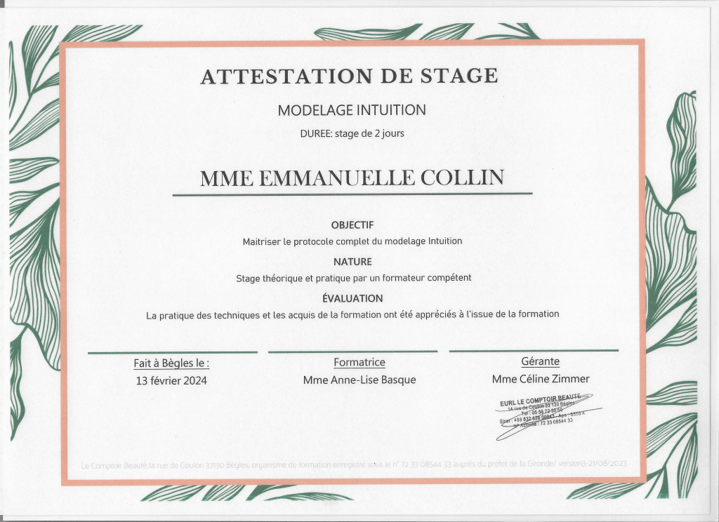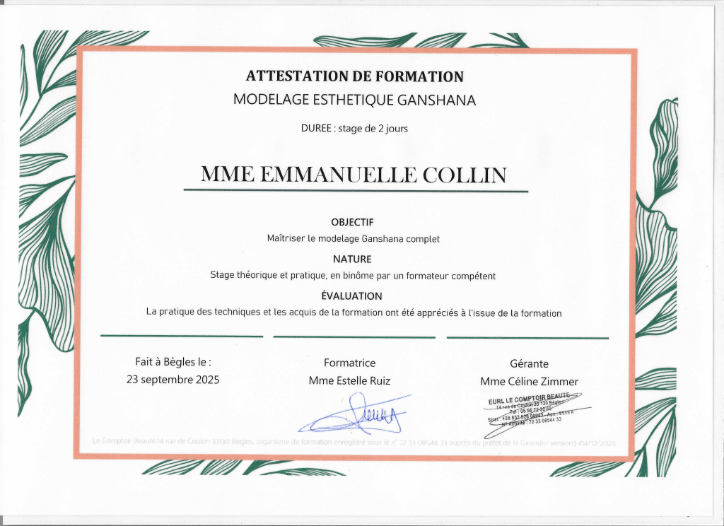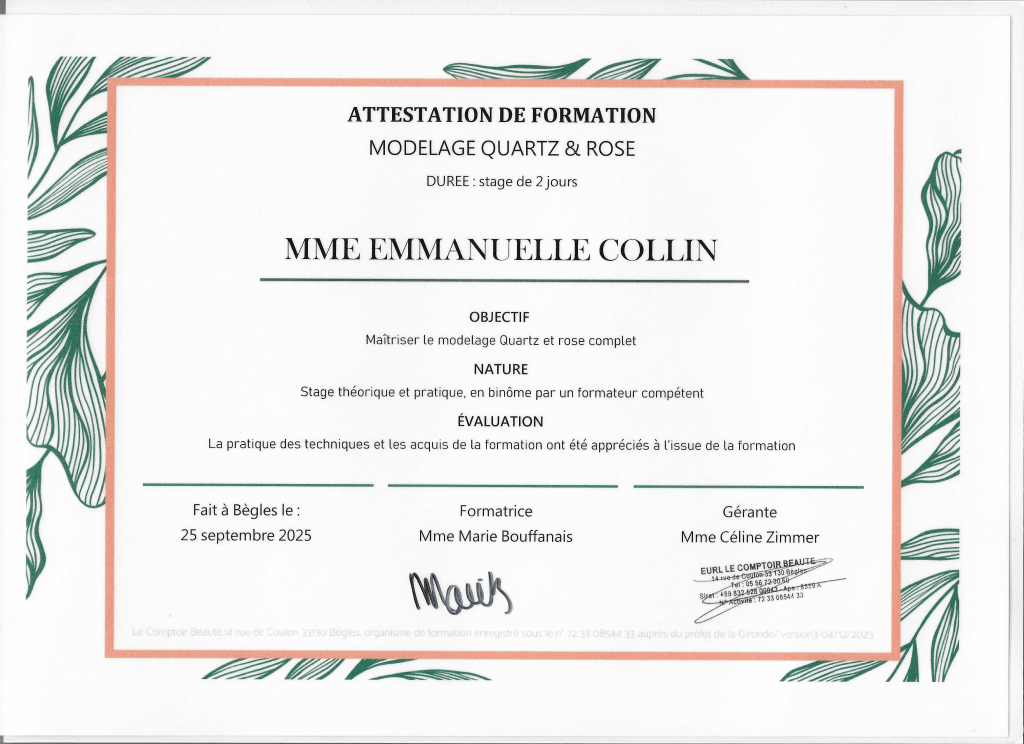Je continue de me former régulièrement, notamment au Comptoir Beauté à Bordeaux, pour vous offrir le meilleur de chaque technique.